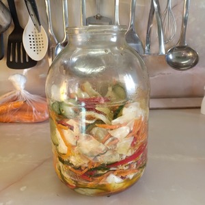Салат перемешать и плотно уложить в банку. Закрыть крышкой и отправить в холодильник на пару часов. Периодически салат надо встряхивать, чтобы он хорошо промариновался.