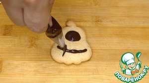Для основного украшения используем растопленную шоколадную глазурь (или растопленный шоколад) и кондитерский мешок. Можете нарисовать глазки, рот и детали, чтобы придать печенью индивидуальность. (в видео всё детально показано)