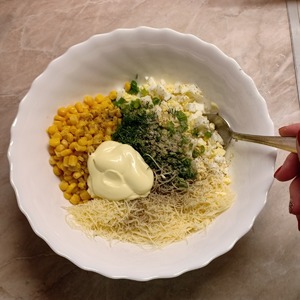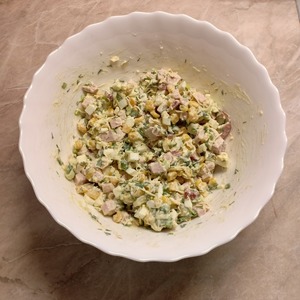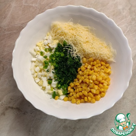 Из банки с кукурузой слить воду. Ветчину, яйца, сыр, кукурузу и зелень выложить в глубокую миску.