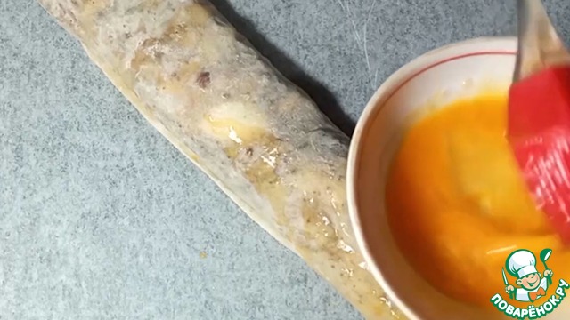 Сверните лаваш в рулет и смажьте сверху яичным желтком. Выпекайте в духовке 15 минут при температуре 180 градусов.