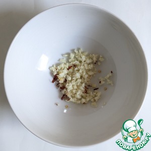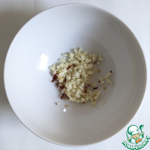 Между делом мелко нарезать чеснок и перец чили. У меня 1 маленький, но очень острый.
