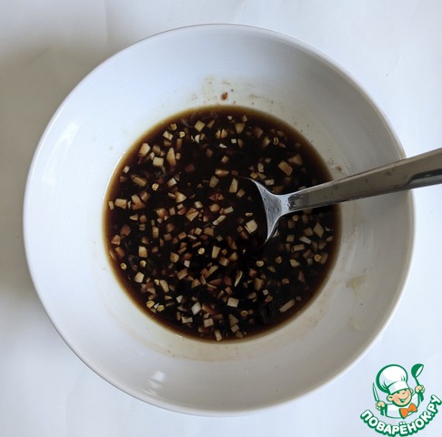 Добавить к чесноку 4 ст. ложки соевого соуса, 3 ст. ложки соуса шрирача (осторожно, очень острый!), 2 ст. ложки сиропа и лимонный сок из половины лимона, перемешать.