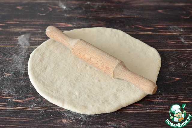 Подпылите стол мукой и раскатайте тесто в круг диаметром около 35 см.