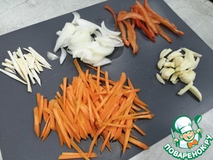 • Перец, морковь, чеснок, лук и коренья ( у меня корень петрушки) нарезать соломкой.