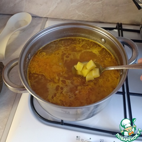 Картофель очистить, нарезать средними кубиками и добавить в суп.