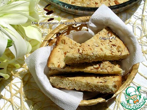 Посыпьте рубленным миндалем, прижмите ложкой, вдавливая миндаль в тесто, разровняйте.