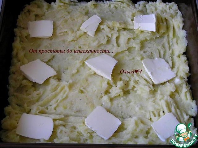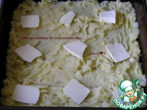 Выложите половину картофельной массы в форму для запекания (у меня 19х19 см), смазанную маслом. Сверху разложите кусочки сливочного масла.