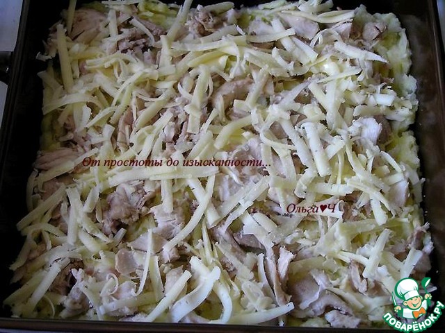 Выложить кусочки филе (или разобранное на волокна), присолите и поперчите, если нужно. Посыпьте половиной тертого сыра.