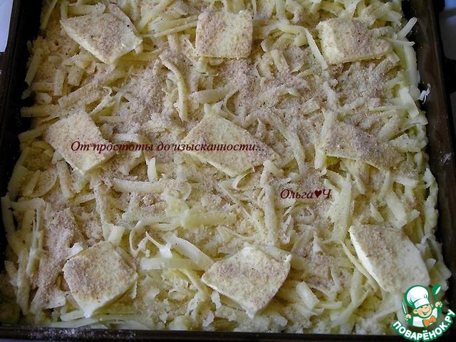 Сверху выложите оставшуюся картофельную массу, тертый сыр, посыпьте сухарями и выложите еще кусочки масла.