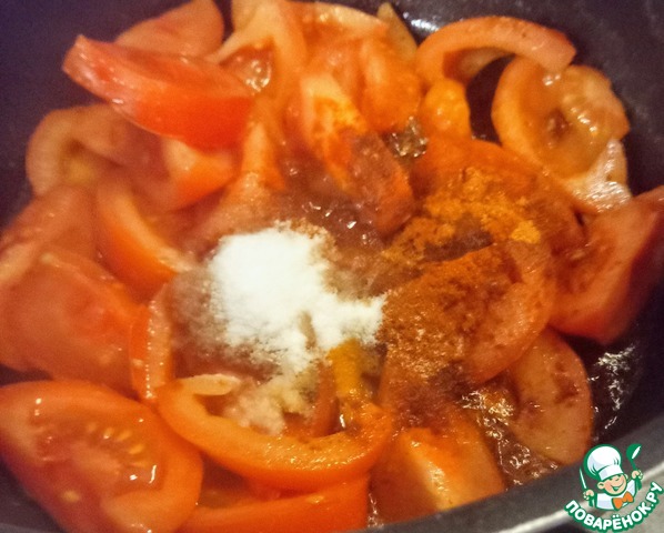 Добавить сахар, красный жгучий перец, паприку и томатную пасту. Перемешать.