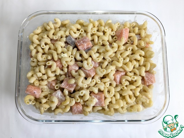 • Слить воду с рожек, высыпать в форму, добавить лосось.