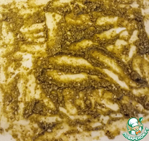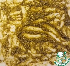 Раскатать слоёное тесто Смазать поверхность соусом песто, отступая приблизительно 1 см от краев со всех четырех сторон образовавшегося прямоугольника.
