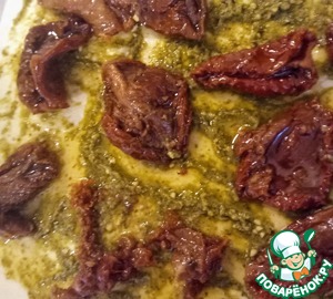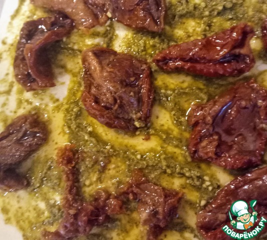 На песто выложить вяленые томаты.. Поместить в духовку на 30 мин при 180 С.