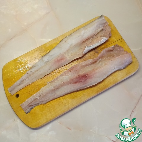 Тушки минтая почистить, удалить внутренности и черную пленку, помыть под проточной водой и разделить на филе.