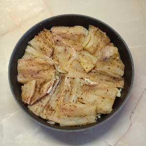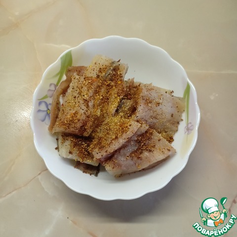 Выложить филе в глубокую миску, посолить, поперчить, добавить приправы, перемешать и оставить мариноваться на 20мин. Если вы поделили рыбу на 2 больших филе, то посыпьте их сверху приправой прямо на доске и никуда не убирайте.