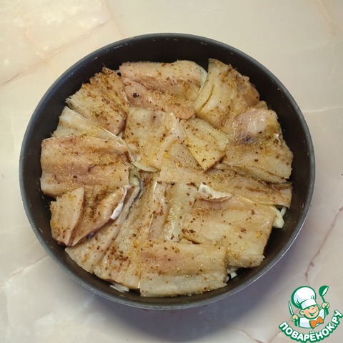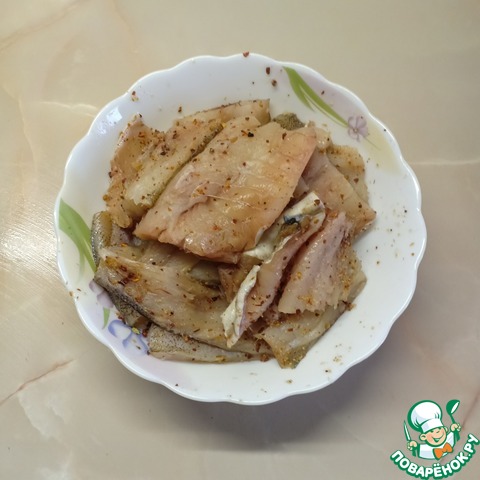 Филе рыбы нарезать порционными кусочками. Можно просто разделить на филе и запечь так.
