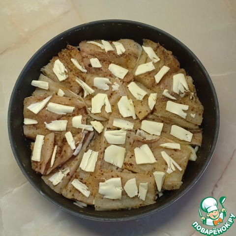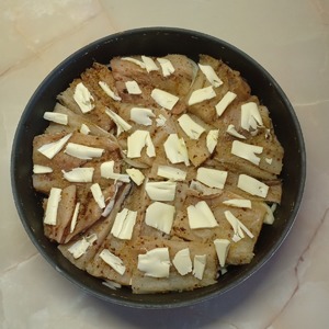 Сверху выложить сливочное масло, нарезанное тонкими ломтиками. В оригинале рецепта это все выкладывается на фольгу, заворачивается и запекается в духовке, но у меня фольги оказалось мало, поэтому я сделала небольшой экспромт, что тоже оказалось очень вкусно.