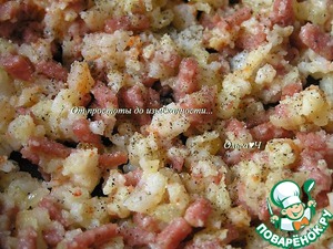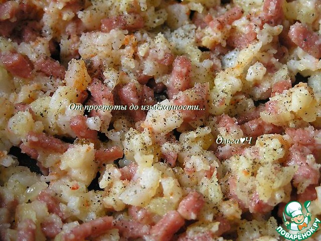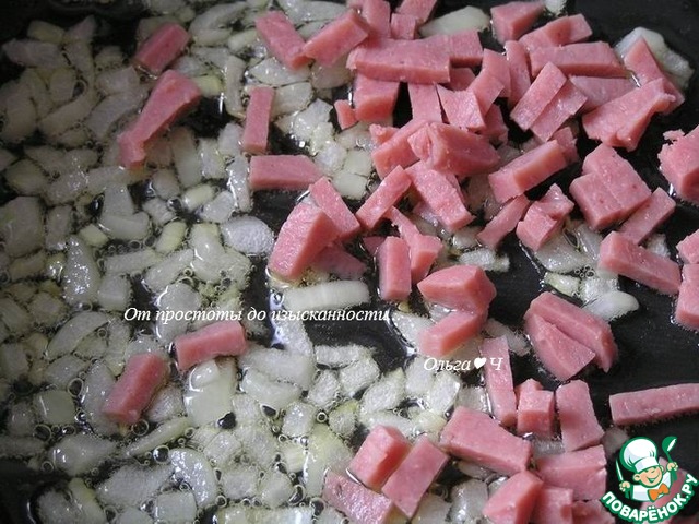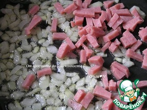 Добавьте мелко нарезанную ветчину, обжарьте.