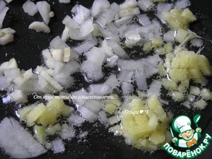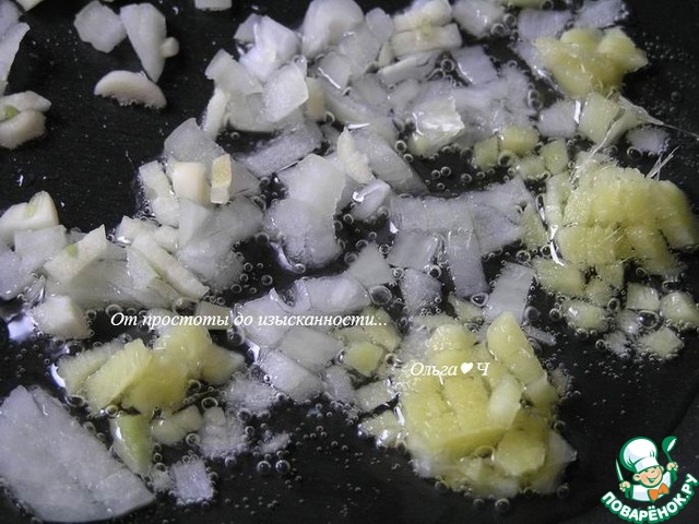 Приготовьте соус. На растительном масле обжарьте мелко нарезанный лук, корень имбиря и чеснок.
