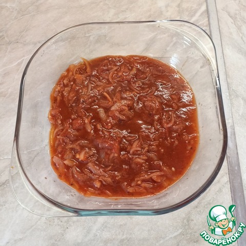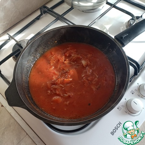 Томатный соус влить в сковороду с обжаренным луком, добавить воду и прогреть. Половину соуса переложить в мисочку.
