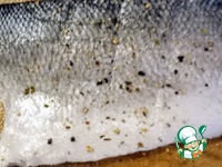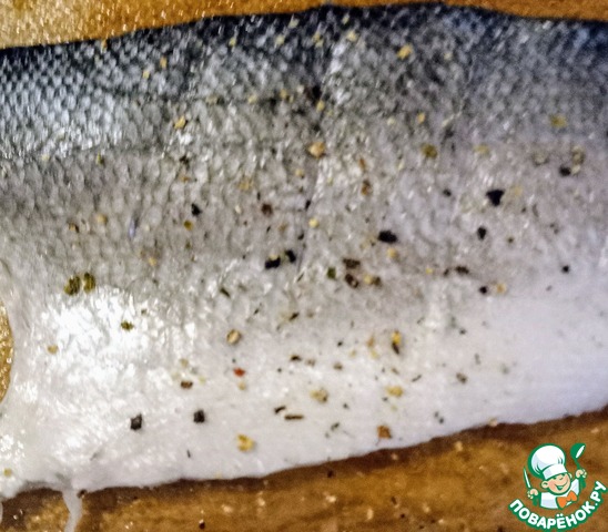 На морском окуне сделать надрезы крест-накрест (как показано на фото). Посолить, поперчить. |