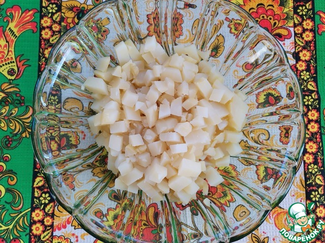 Отварить яйца и картофель в мундире. Остудить, очистить.