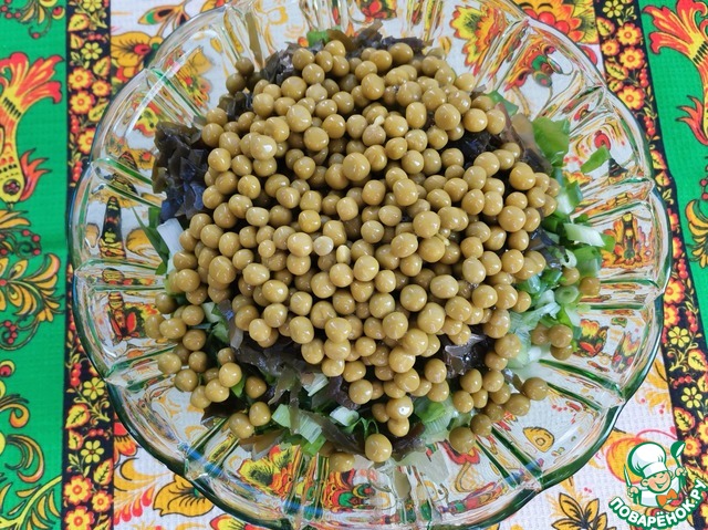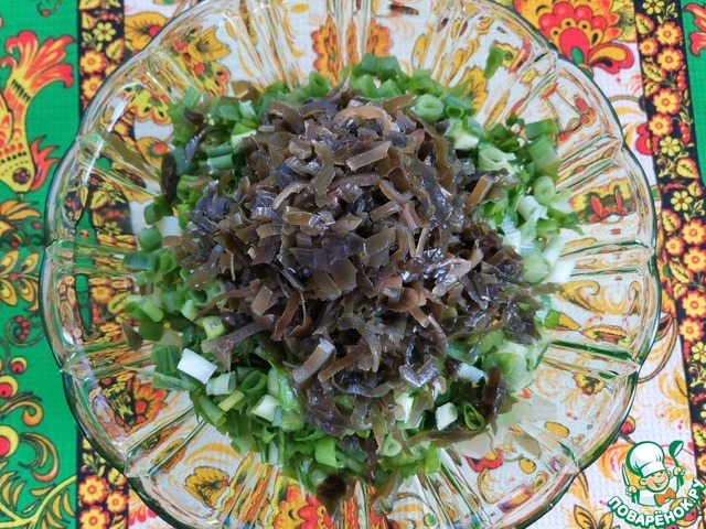 Порубить морскую капусту, чтобы потом не висела шнурками на вилке.