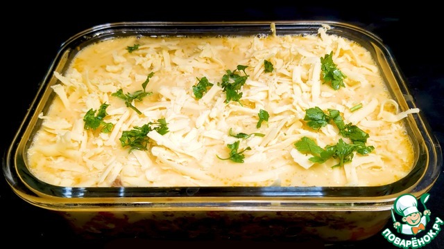 Сыр и выпекание: Посыпьте блюдо тёртым сыром (100 г), свежей нарезанной зеленью и поставьте запекаться в духовку при 200°C ещё на 25 минут, пока сыр не расплавится и не образует румяную корочку.