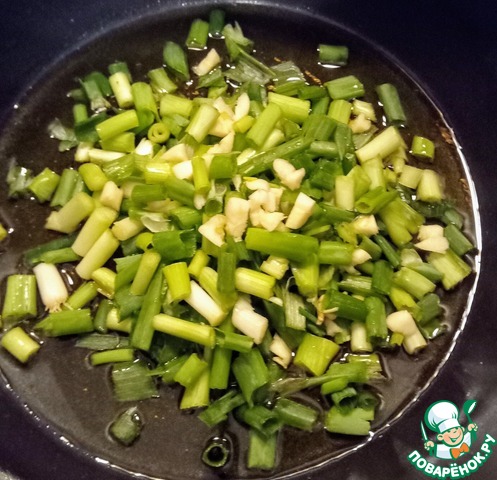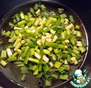 В глубокой ёмкости на среднем огне разогреть масло и добавить лук зелёный, чеснок и имбирь. Готовить, помешивая, минут 5 до размягчения лука, но не до потери им цвета.