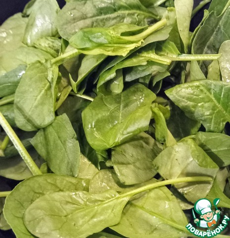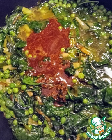 Добавить шпинат, чайную ложку соли, увеличить огонь и готовить минуты 2-3 до сворачивания шпината.