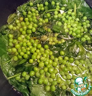Добавить замороженный горошек, готовить минут 8. Затем убрать с огня и немного охладить.