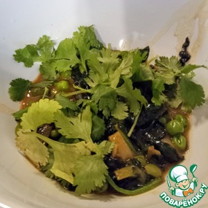 Шпинатную смесь посыпать кинзой.. Подавать в неглубоких ёмкостях, можно как гарнир, можно в качестве основного блюда. Приятного аппетита.