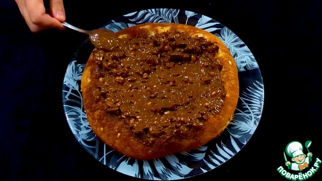 Аккуратно переверните торт на тарелку, затем верните на сковороду другой стороной.