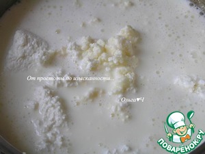 Молоко вскипятите, добавьте творог, доведите до кипения, помешивая, сразу снимите с огня.
