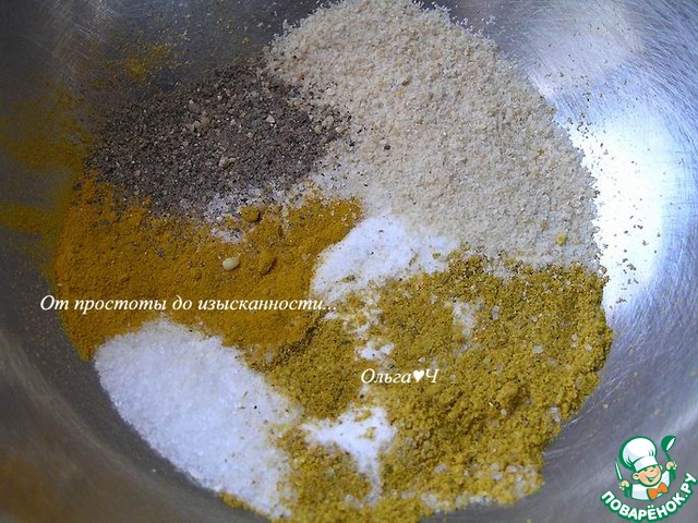 Смешайте куркуму, карри, черный перец, соль и соду.