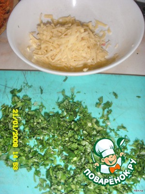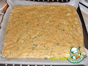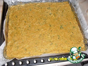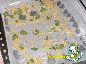 Выстелить кальку на форму, равномерно обсыпьте тертым голландским сыром и разбросайте листики кинзы.