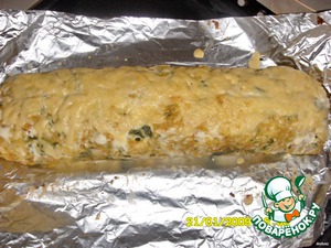 На готовый корж распределить начинку, свернуть рулетом, после (погрешности) :-[ верхний слой обмазала слегка майонезом, обсыпала тертым голландским сыром и положила в духовку - 8-10 мин.