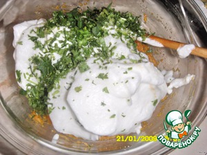 Положить белки в миску к моркови и нарезанную мелко кинзу.