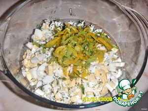 Отварить яйца, мелко нарезать, смешать все и добавить майонез, соль, перец по вкусу.