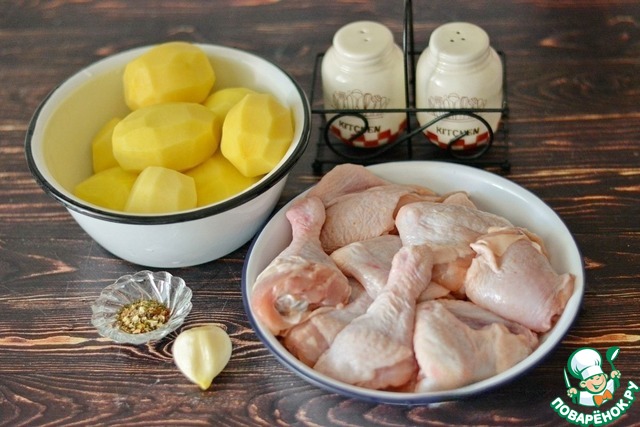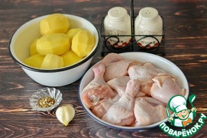 Подготовьте все необходимые продукты для приготовления деревенского жаркого из курицы с картошкой.