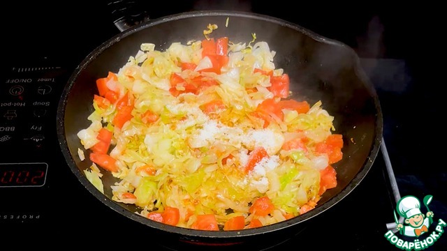 Нарежьте 1/4 капусты соломкой и 1 помидор мелко. Разогрейте немного растительного масла на сковороде, добавьте сначала капусту. Жарьте помешивая 1 минуту. Затем добавьте помидоры овощи и 1/2 чайной ложки соли. Накройте крышкой и тушите 2 минуты.