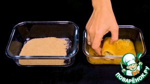 Разбейте одно яйцо в чашку и добавьте немного соли, взбейте. В другую чашку насыпьте немного панировочных сухарей. Обмакните каждый блин сначала в яичную смесь, а затем в сухари.