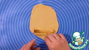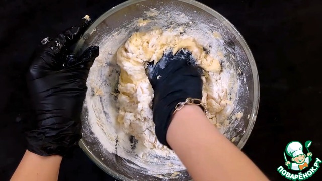 Постепенно добавьте половину муки, замешивая тесто. Затем добавьте сливочное масло небольшими кусочками, а после оставшуюся муку, замесите эластичное тесто. -