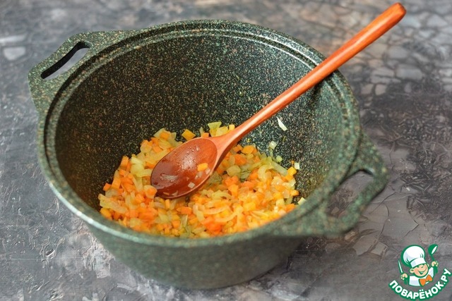 В глубокой сковороде, сотейнике или казане разогрейте масло. Очистите лук и морковь, нарежьте их кубиками и на разогретом масле обжарьте до золотистого цвета.