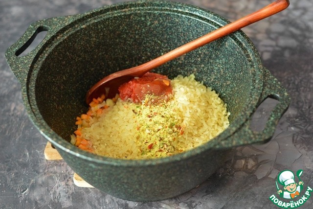 Промойте на сите рис и дайте стечь воде. Всыпьте в казан рис, добавьте томатную пасту, приправу и соль.