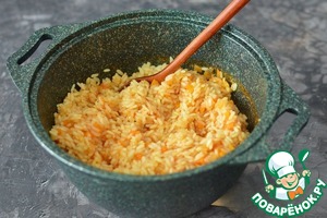 Влейте воду и размешайте хорошенько содержимое казана. Доведите рис до кипения, убавьте огонь до среднего и накройте казан крышкой. Варите рис примерно 15-20 минут на среднем огне. Периодически помешивайте рис, чтобы он не подгорел.