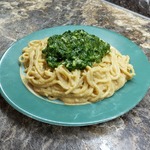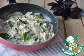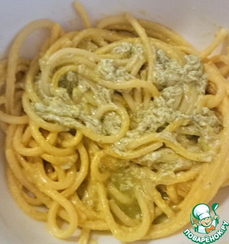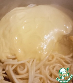 процессе варки макарон выделяется крахмал. Добавлять ее лучше постепенно, для того, чтобы соус стал кремообразным и полностью перемешался с макаронными изделиями.