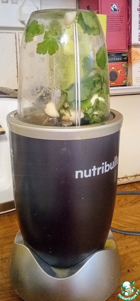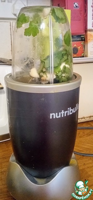 В блендер положить петрушку, соль (пол--ложки), лимонный сок, чеснок, масло сливочное, перец чили. Размешать до однородности. Убрать из блендера. Это будет соус из петрушки и чеснока.