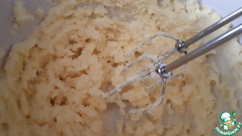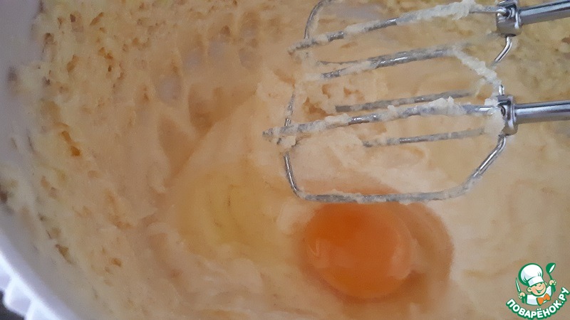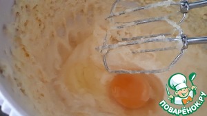 Добавляем по одному 4 яйца, и каждый ввод одного яйца взбиваем примерно 30 секунд на высокой скорости миксера.