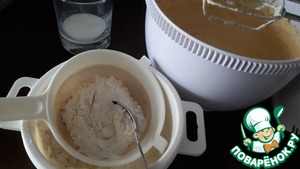 Муку просеять с разрыхлителем, отмерять 2 ст. л. молока